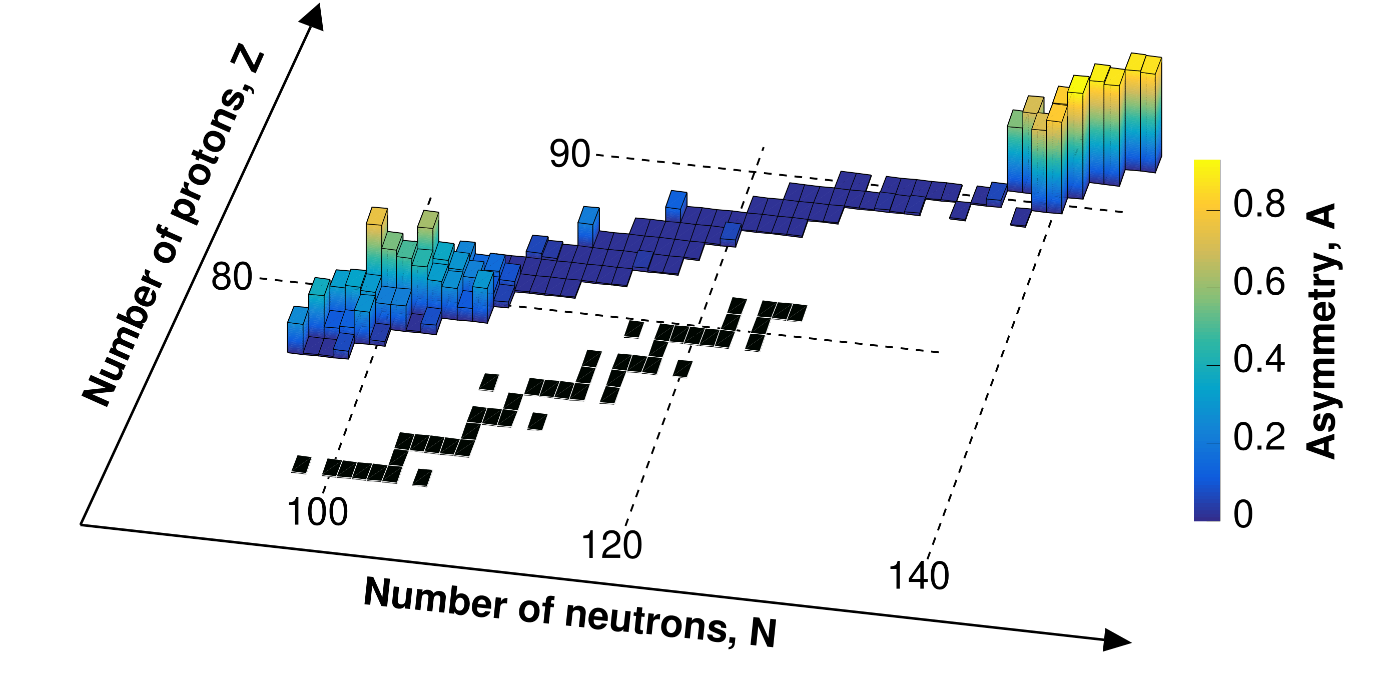 Une campagne de mesure pionnière a permi de cartographier de manière systématique l’asymétrie entre fragments générés lors de fissions nucléaires. Deux « îles » de fission majoritairement asymétrique ont été mises en évidence en fonction du noyaux père. Celle en bas à gauche correspond à des fissions asymétriques récemments découvertes dans la région du mercure (Z = 80). Notre étude montre que ce type de fission est favorisé par la présence d’un fragment léger de krypton (Z = 36). Ces travaux ont été publiés dans la revue Nature.